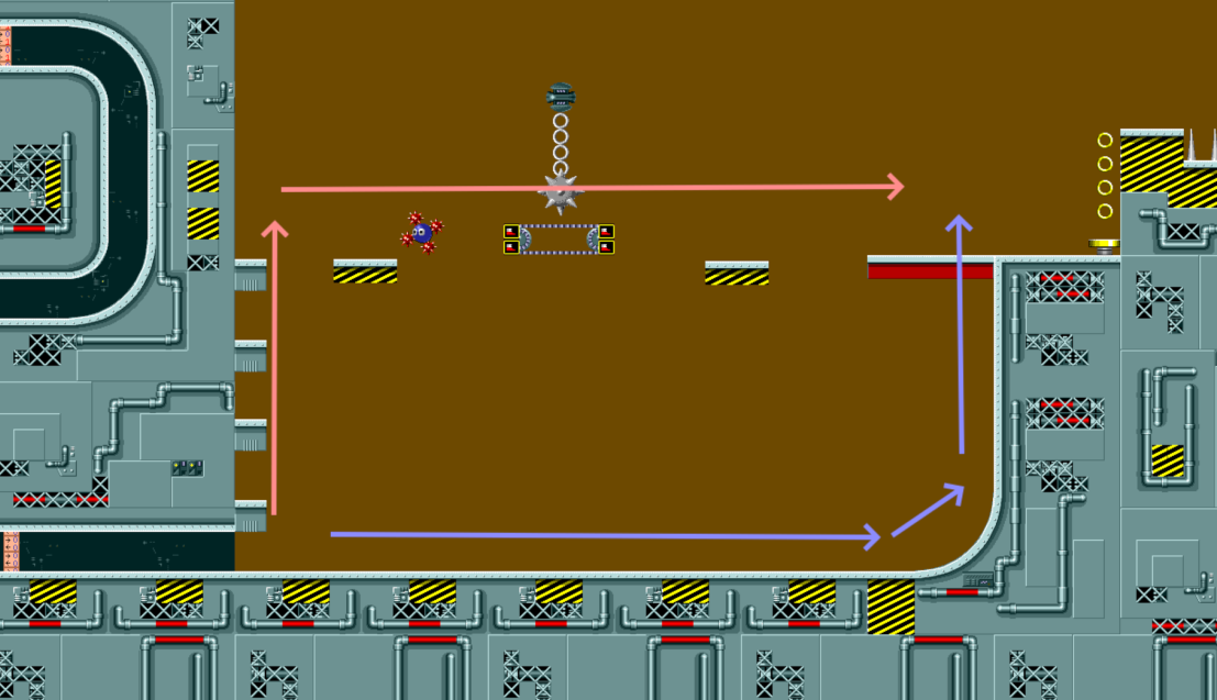 The orbinaut, platform and swinging platform combo here serves NO level design point, does not reward you for your trouble, is completely pointless and only punishes you for attempting to explore the level.